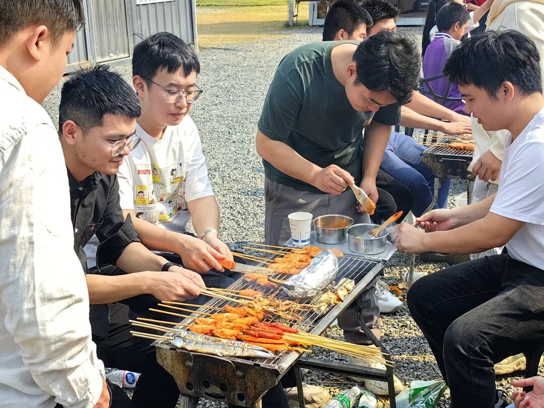 烧烤炉架起,袅袅烟气开始升腾,美食在烤架上的样子,真是让人垂涎欲滴;香味一次次冲击味蕾,馋得大家兴奋不已。别看平日工作严谨认真的他们,今天摇身一变都是“烧烤师”,给大家奉献美味。你负责刷油,我负责刷酱,大家围坐在一起,边烤边吃、边吃边聊,同时也不忘互相递送烤好的肉串,在相互协作中享受“自己动手、丰衣足食”的乐趣。